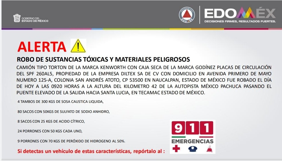 #Atención ⚠️ @pciviledomex emite #Alerta por "Robo de Sustancias Tóxicas y Materiales Peligrosos" en camión tipo torton con las siguientes características: Si detectas el vehículo reportalo al 911. #PrevenirEsVivirpic.twitter.com/GCZBnN5Jcl