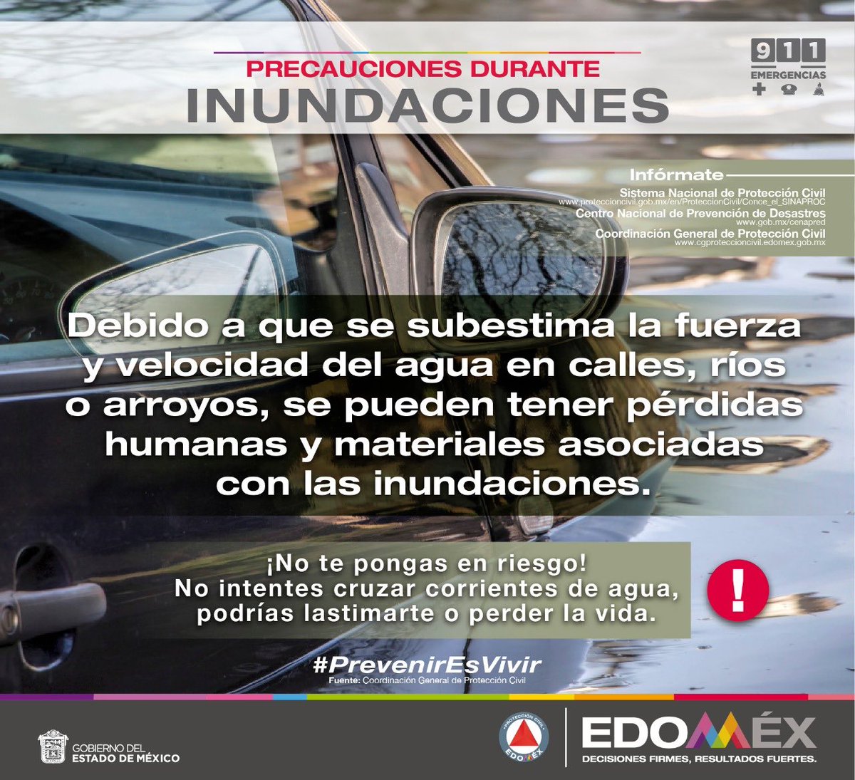No arriesgues tu vida, si se presenta una #Inundación o #Encharcamiento no trates de cruzar o nadar por caminos inundados. #PrevenirEsVivirpic.twitter.com/7iQSzRvzVG