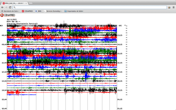 Este es el sismograma oficial de monitoreo del CENAPRED, los colores solo diferencian los períodos de cada 15 mins.pic.twitter.com/CF1fCEzggK