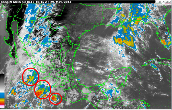 “En la imagen de satélite se observan zonas de tormenta que afectan las costa de Jalisco, Michoacán y Guerrero. pic.twitter.com/fIpZ76QjtW”