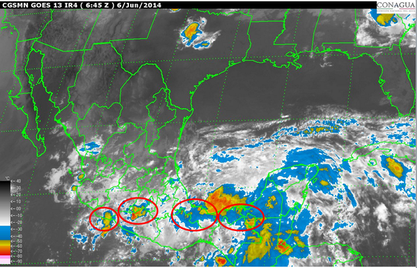 En la imagen de satélite se observan zonas de tormentas en Michoacán, Guerrero, Oaxaca, Veracruz, Tabasco y Chiapas. pic.twitter.com/VrJ9O5aaEN”