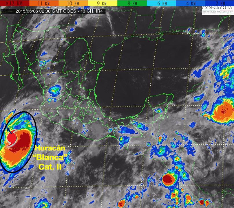 22h Huracán #Blanca ahora Cat. II en el #Océano se ubica en16.1°N y108.3°W a775km al sur-sureste de CaboSanLucas, BCS pic.twitter.com/zsYu3CJOug