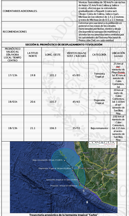 Esta mañana la Tormenta Tropical #Carlos se va debilitando y tocará tierra en las Costas de Jalisco, en Playa Perula, #Atencion a @PCJalisco