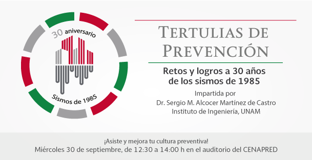 "Retos y logros a 30 años de los #Sismos de 1985". Tertulias de #Prevención en #CENAPRED, miércoles 30 Sep 12:30 pmpic.twitter.com/5R0qImzvCs