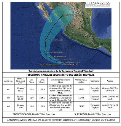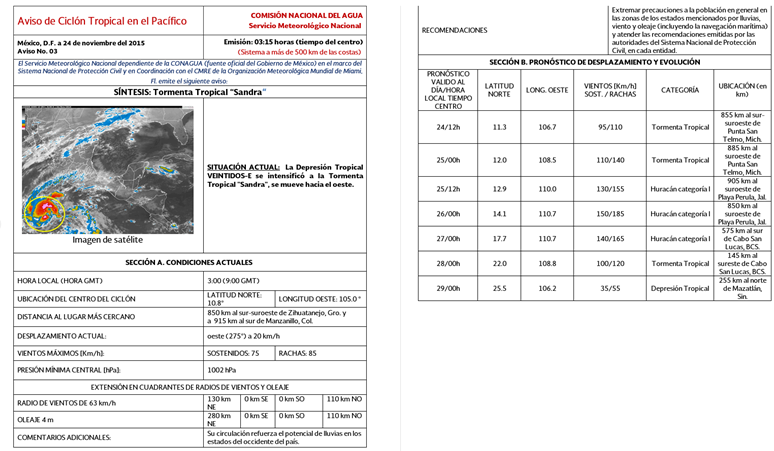 Aviso de la #TormentaTropicalSandra del Océano Pacífico de las 03:15 horas, consúltalo en http://smn.conagua.gob.mx/index.php?option=com_content&view=article&id=60&Itemid=63 …pic.twitter.com/YQWvI9T3JZ