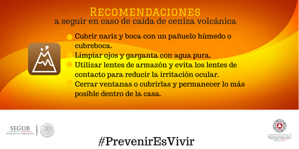 En caso de caída de ceniza cubre tu nariz y boca con un pañuelo húmedo o cubreboca #PrevenirEsVivirpic.twitter.com/LPuFeyYAZh