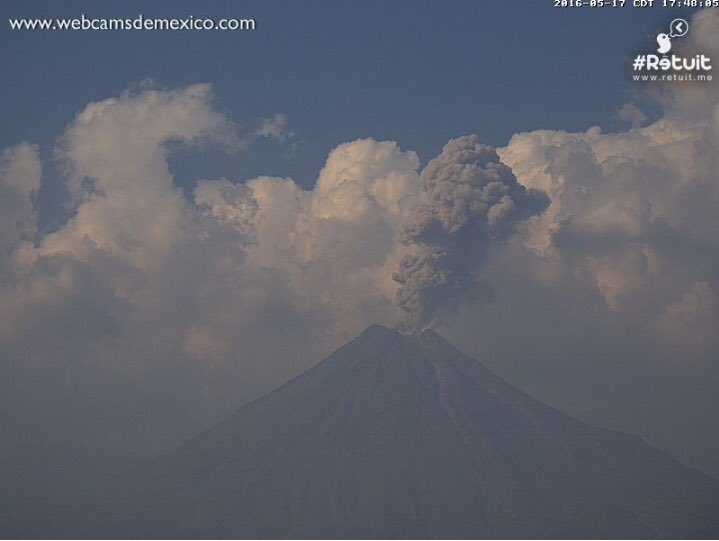 Exhalación #VolcánDeColima a las 17:46 Hrs, altura 1,800 mts, dirección al este-noreste y bajo contenido de cenizapic.twitter.com/y49FuafmxI