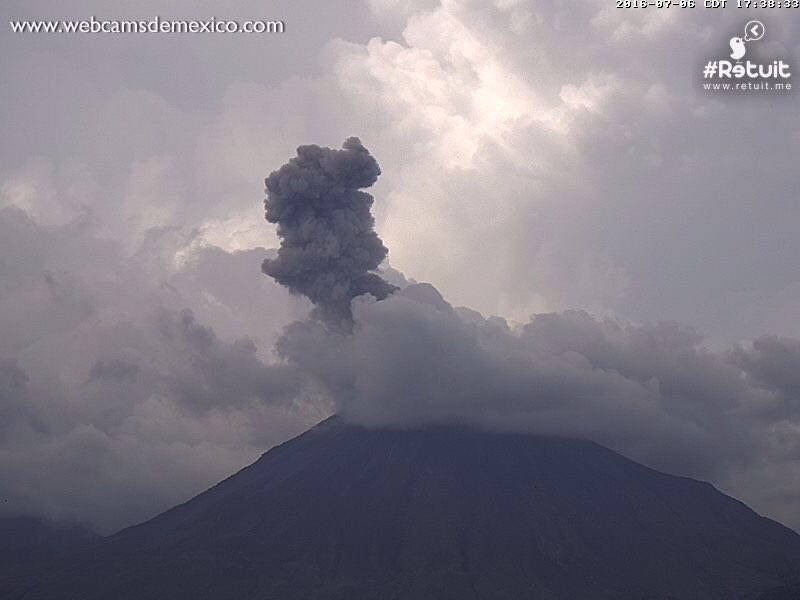 Exhalación #VolcánDeColima a las 17:36 horas, altura 1,500 metros en dirección suroeste con bajo contenido de cenizapic.twitter.com/jCTaedkNGI