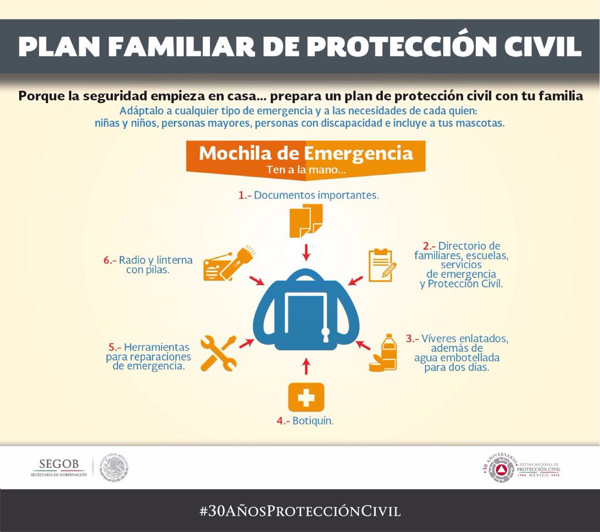 Incluye en tu plan de #ProtecciónCivil una mochila de emergencia, adaptada a las necesidades de tu familia.pic.twitter.com/w8qzFnq2OU
