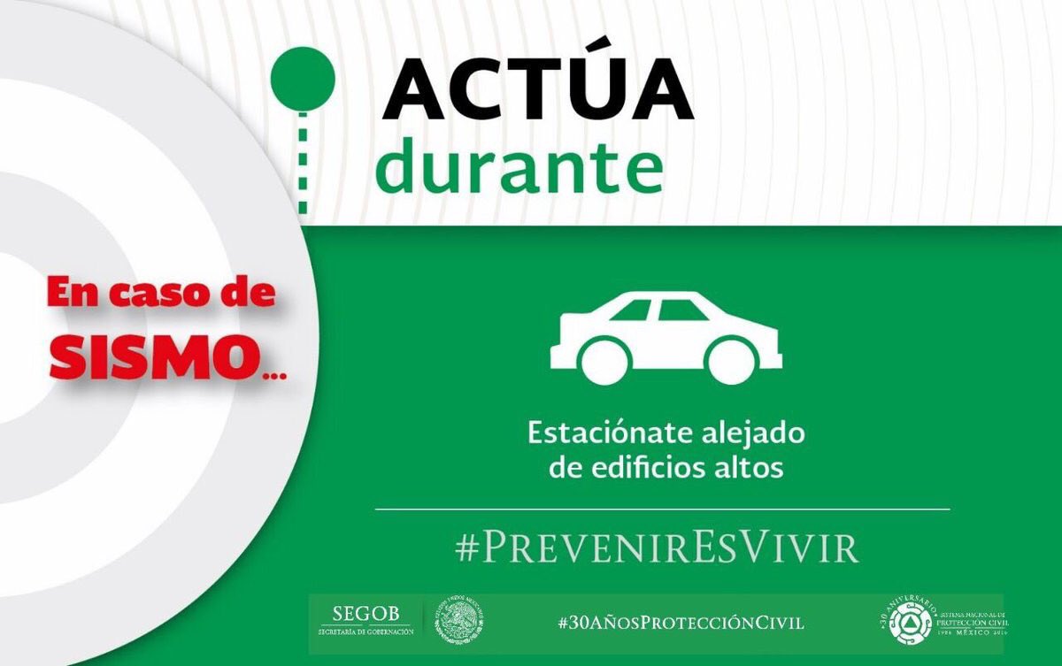 ¿Sabes cómo actuar si durante un #Sismo vas manejando? Mantén la calma y estaciónate en un lugar seguro.pic.twitter.com/wCKfbRJoDi