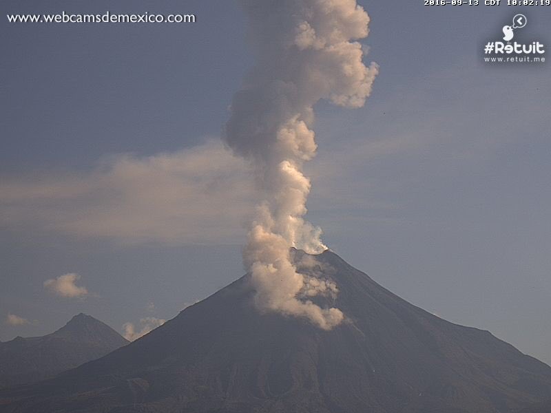 Exhalación del volcán de Colima a las 09:58 h de 1,700 metros en dirección al noroeste. Imagen de @webcamsdemexico.pic.twitter.com/9mLFgzVbjA