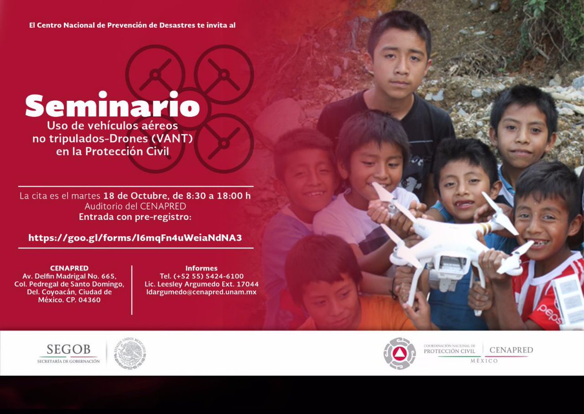 Inscríbete en el Seminario Uso de Drones en la Protección Civil este 18 de octubre en el #Cenapred. Entrada libre: http://www.gob.mx/cenapred/articulos/drones-una-nueva?idiom=es …pic.twitter.com/vrAmBVg4PI