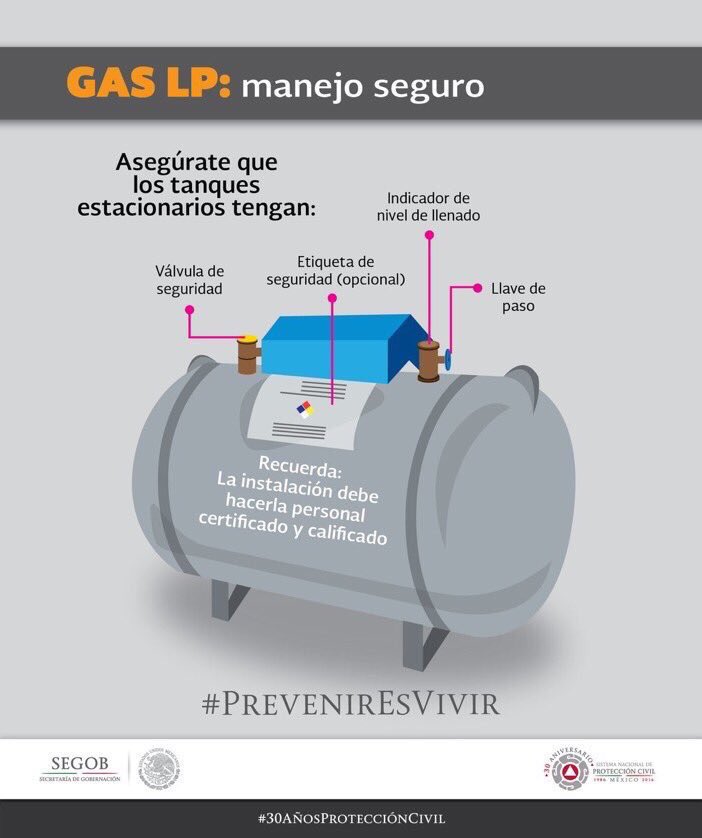 Revisa tu tanque estacionario y asegúrate que tenga válvula de seguridad y llave de paso. ¡No te expongas! #PrevenirEsVivirpic.twitter.com/XMiSZWrffr