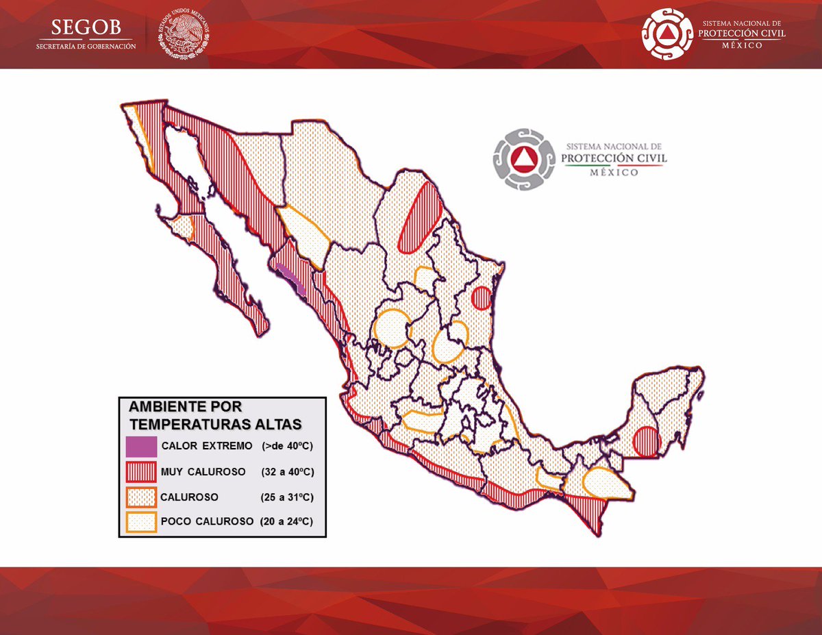 Se pronostican temperaturas de hasta 40°C para regiones de #BCS, #Sin, #Col, #Son, #Coah, #Tamps, #Chis, #Nay, #Mich, #Jal, #Gro y #Oax.pic.twitter.com/WO3p2cNeFk