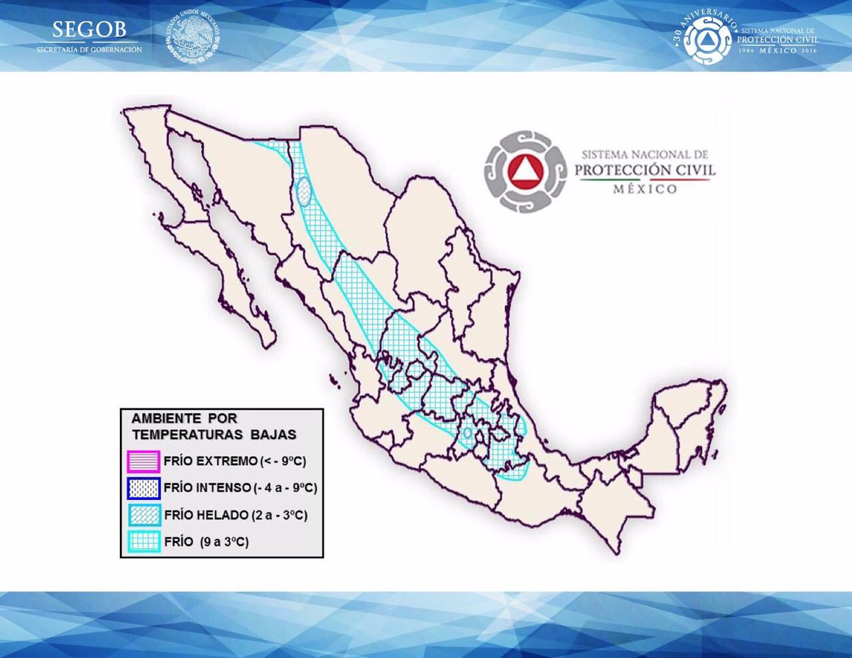 Se prevén temps. de 2 a -2°C en #Chih #Edoméx y de 9 a 3°C en #Jal #Mich #SLP #Ver #Son #Oax #Zac #Dgo #Gto #Pue #Ags #Hgo #Tlax y #CDMX.pic.twitter.com/dFhCXp87K9