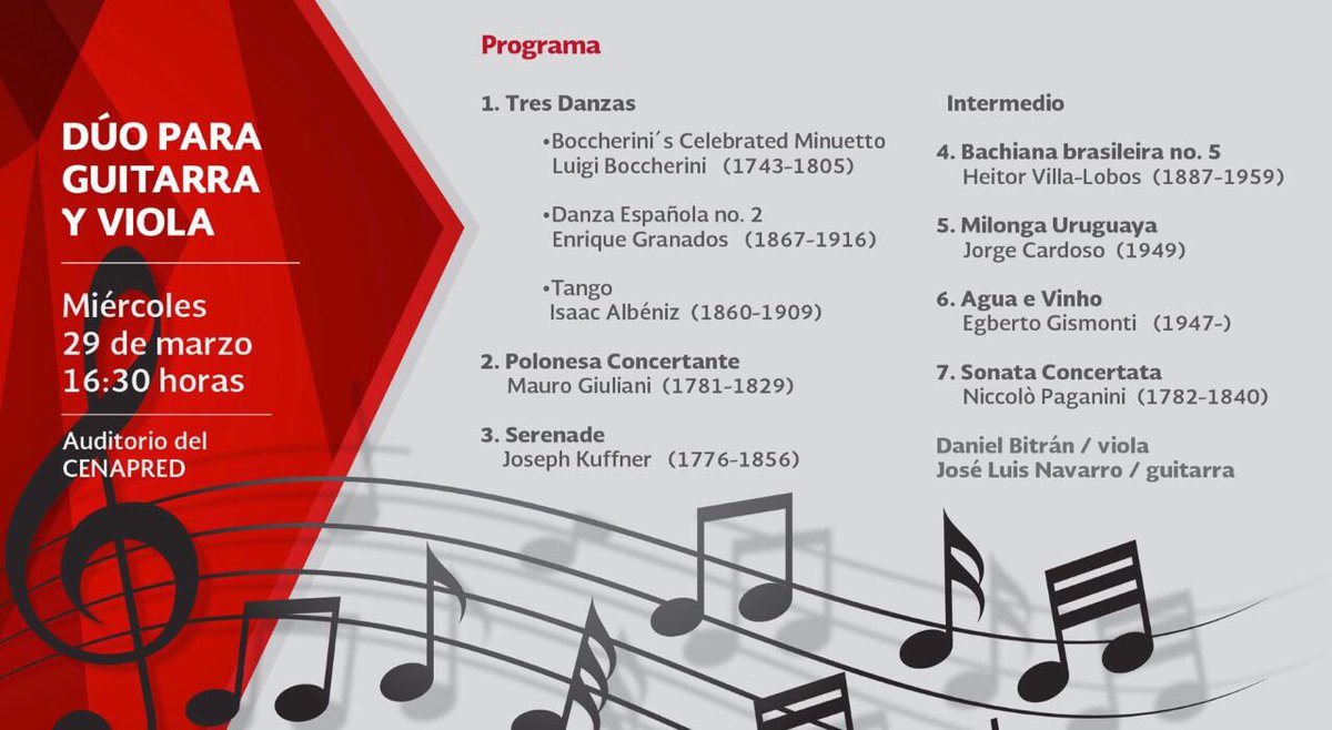 Te invitamos al #Concierto de guitarra y viola que se llevará a cabo en #CENAPRED, el miércoles 29 de marzo a las 16:30 horas 🎶🎵pic.twitter.com/ceFjgCKEk4
