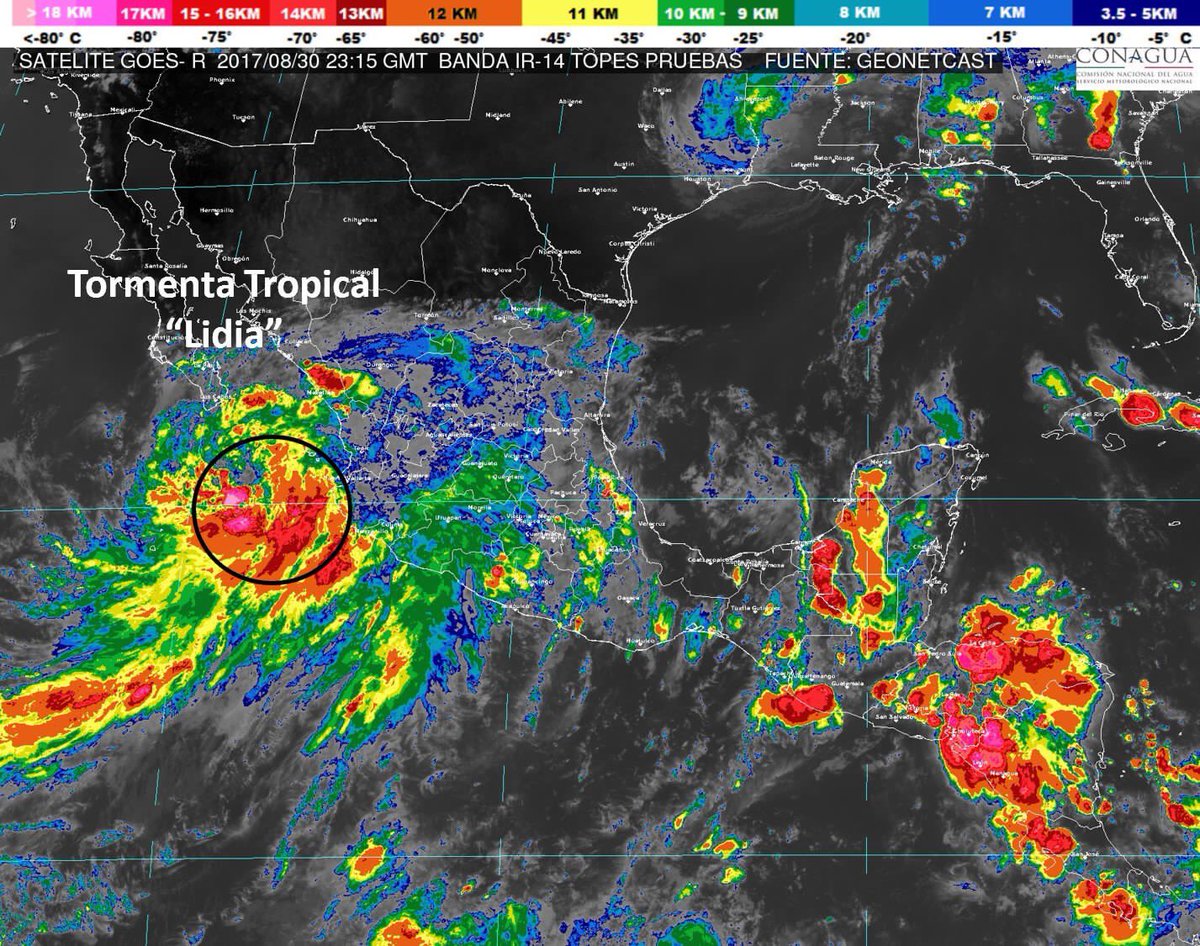La #DT 14-E se ha intensificado a #TormentaTropical “Lidia” se localiza a 290 km al sur-sureste de la Península de Baja California.pic.twitter.com/9tes5wu7AR