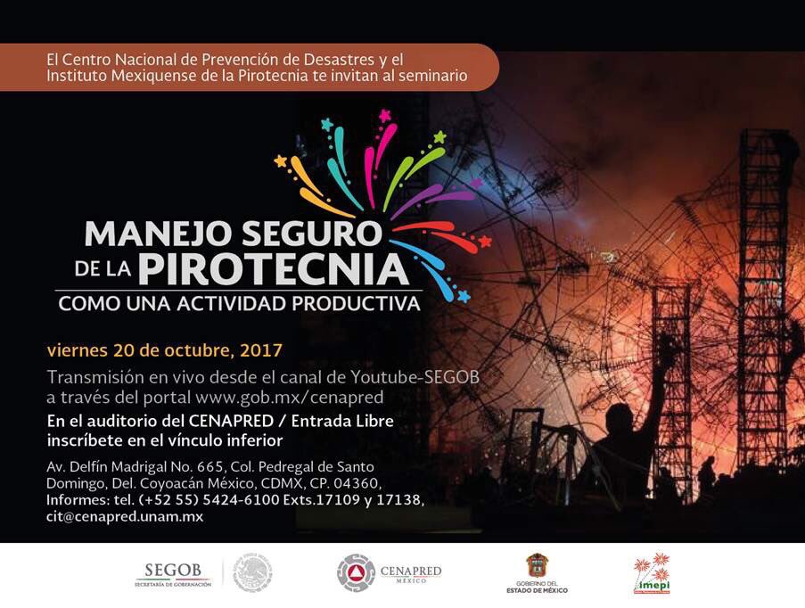 #CENAPRED y el Instituto Mexiquense de la Pirotecnia te invitan al seminario "Manejo Seguro de la Pirotecnia" 🎊: https://goo.gl/forms/6C4F5hUrljTHMTMp2 …pic.twitter.com/HHFf4wlrLW