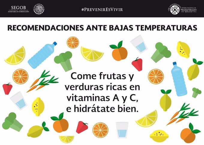 En esta temporada de #Frío, no te olvides de incluir en tus alimentos, frutas y verduras ricas en vitaminas A y C.pic.twitter.com/YwGVwhOwfd