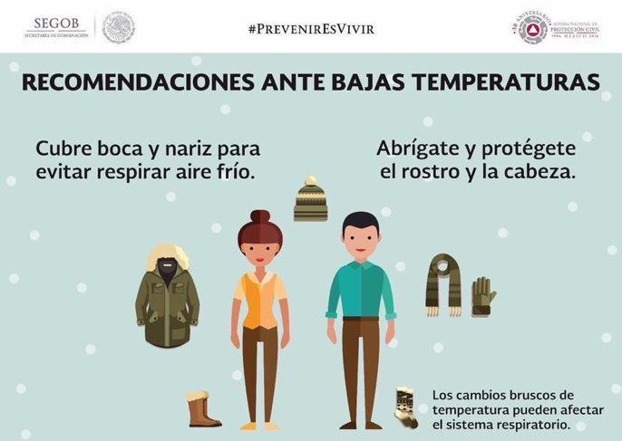 Qué las bajas temperaturas ocasionadas por el #FrenteFrío No.20 no te sorprendan, si hace #Frío en tu entidad, abrígate bien y protégete el rostro y la cabeza.pic.twitter.com/GOPwbdsSjy