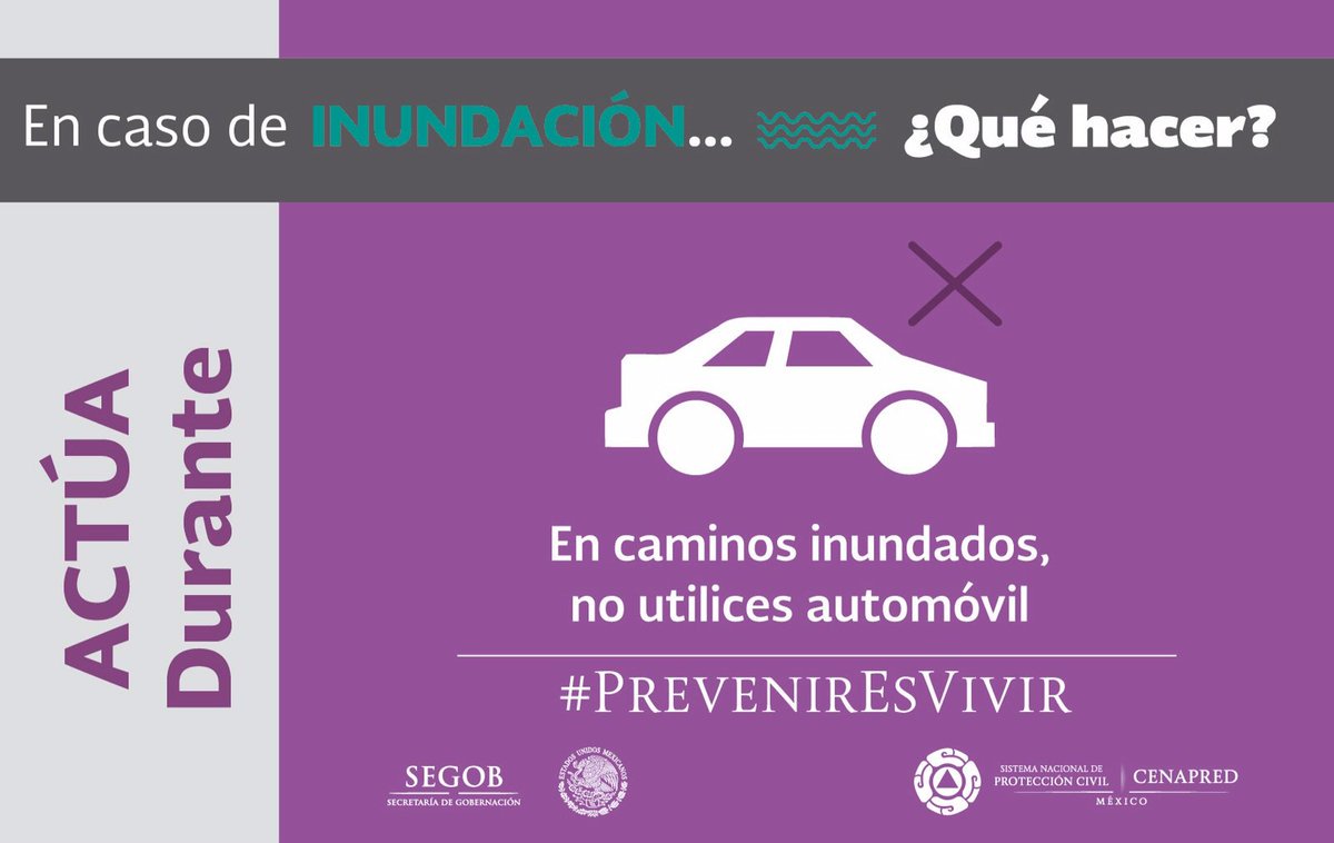 En caso de #Inundación evita utilizar tu vehículo en caminos inundados y no te acerques a postes o cables de electricidad averiados.pic.twitter.com/yNZ2HoDrTa
