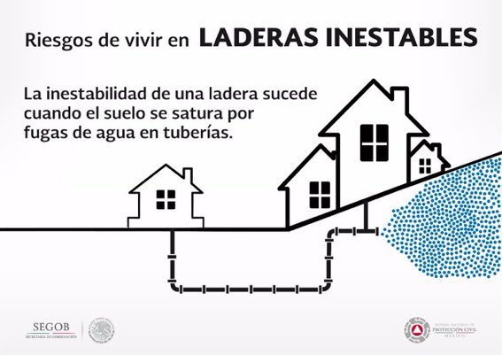 Las #LaderasInestables también pueden suceder cuando el suelo se satura por fugas de agua en las tuberías. ¡Revísalas! #PrevenirEsVivirpic.twitter.com/cFLc4ae9CK