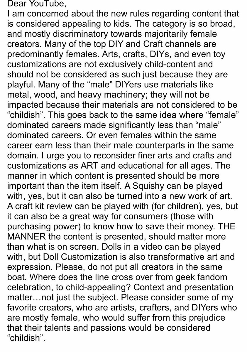 .@YouTube @TeamYouTube You have once again jumped the gun and are selectively punishing one group of people. This change in January 2020 is going to negatively affect many FEMALE craft/diy channels. Why would you consider them as childish just because they use clay or colors?pic.twitter.com/YpHGSNJEfE