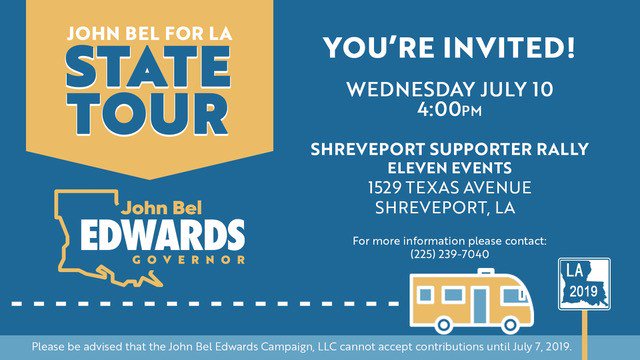 Join Governor Edwards on Wednesday July 10th (TOMORROW) at 11:30am in Alexandria or 4pm in Shreveport!pic.twitter.com/PVd4qPR784