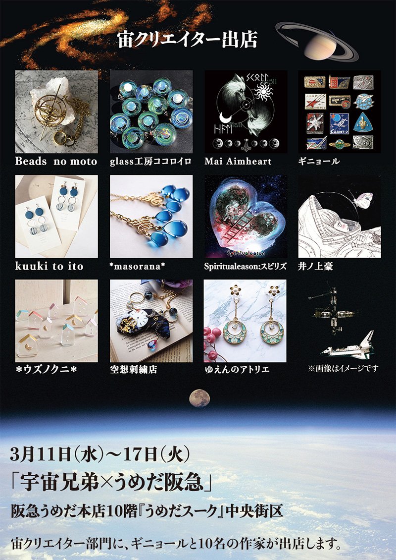 3月うめだ阪急のイベントに宙クリエイター枠で出展させていただける事が決まりました! 期間中は何日か在店予定なので、ぜひ遊びにいらしてくださいね。 3月11日(水)~17日(火) 「宇宙兄弟×うめだ阪急」 ※最終日は午後5時終了 http://guignol.jp/event/2020-03hankyu/ …