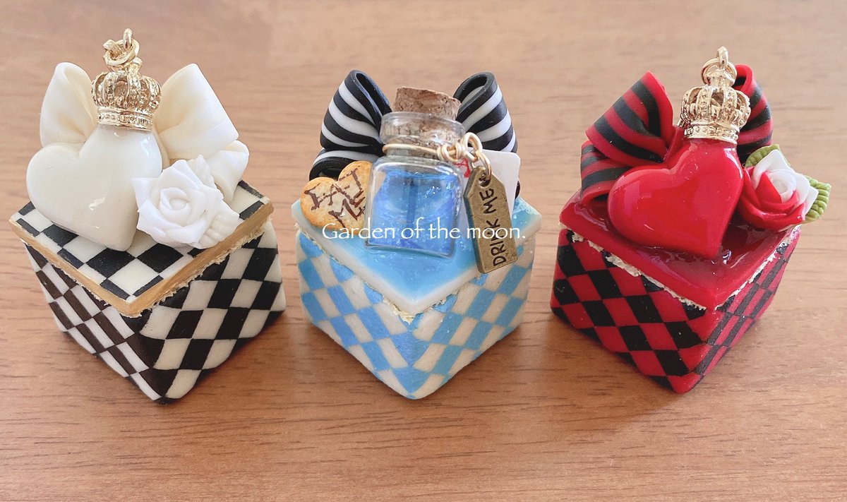 アリスキューブ(中央) 赤の女王キューブネックレス(右) ・各5000円 チェーン60cm+アジャスター