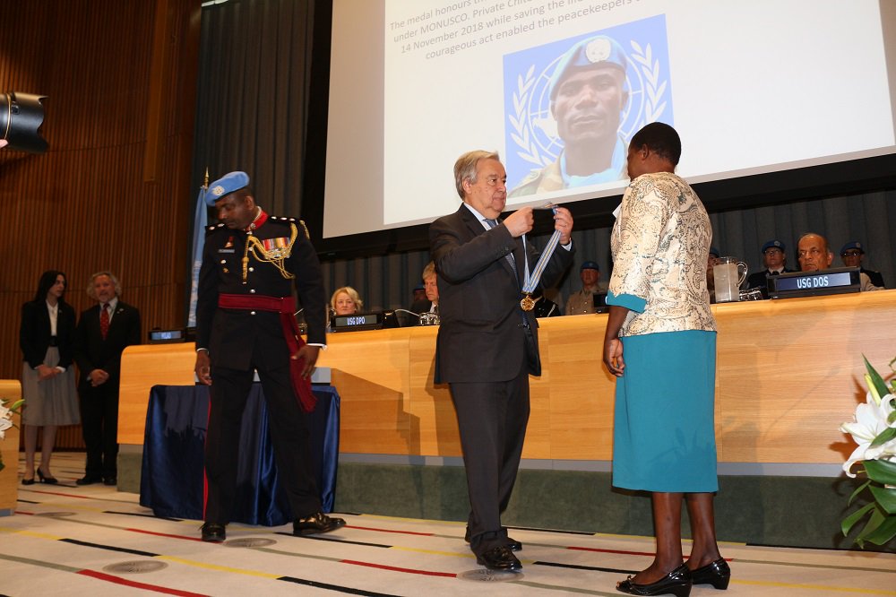 I wish to echo the Secretary-General's deep gratitude for the service & sacrifice of all @UN peacekeepers who perished last year while #ServingForPeace. This year, we honour the late Pvt. Chitete with the Captain Diagne Medal for Exceptional Courage, received by his widow. #PKDaypic.twitter.com/aF18XkghaE