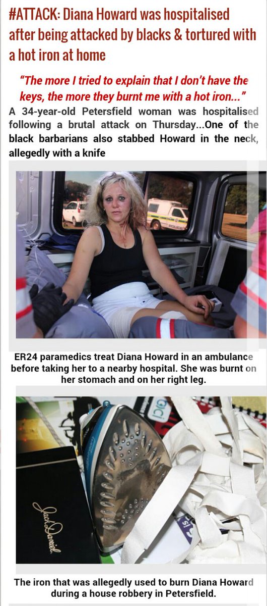 #ATTACK: Diana Howard hospitalised after being attacked by blacks & tortured with a hot iron …http://stopwhitegenocideinsareports.blogspot.co.za/2016/04/attack-diana-howard-was-hospitalised.html …pic.twitter.com/zHBALK3vx5