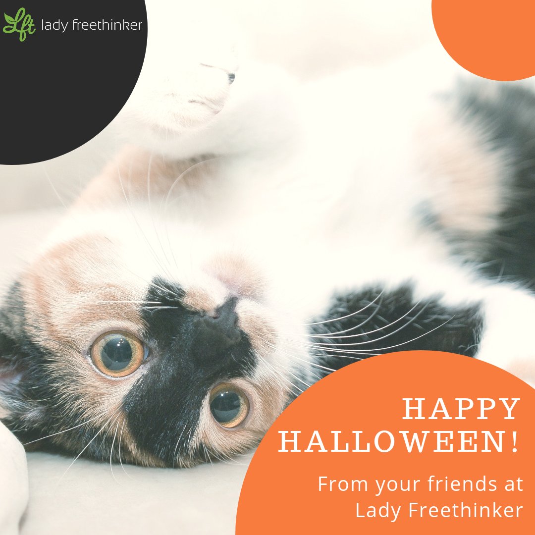 Happy Halloween from Lady Freethinker! ...and a friendly reminder to please keep your cat indoors today. We always recommend keeping cats indoors, but on Halloween it's especially important.pic.twitter.com/DHSISatEEO