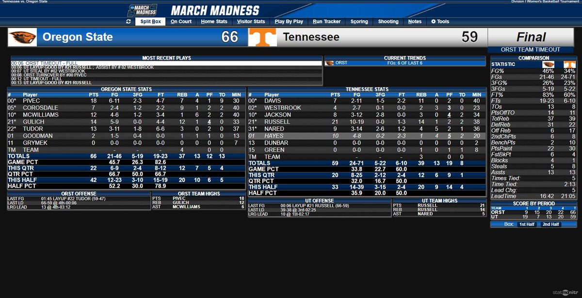 Final Statistics #13/12 Oregon State 66 #12/13 Tennessee 59pic.twitter.com/twJA2XTWvj