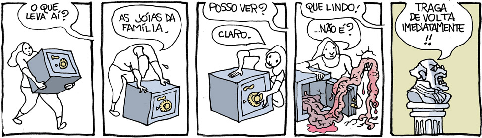 Bixo, tem um busto antigo que provavelmente é antigo e da família do pessoal da charge. Essas tripas e tals saindo são coisas escondidas que o busto não transmite pois o ele apenas apresenta a glória e riqueza para quem vê