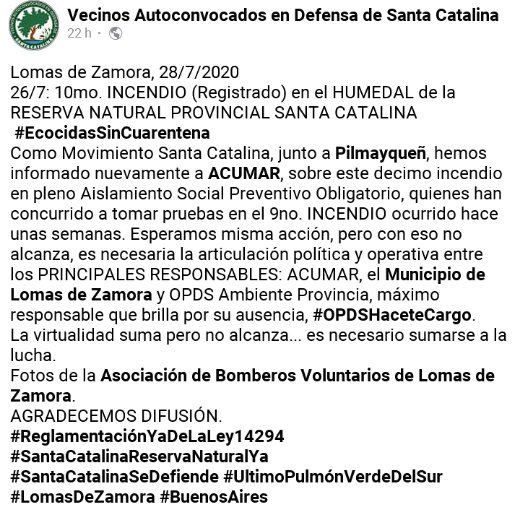 @santacatalinaRN junto a@oapilmayquen, hemos informado nuevamente a@acumarriachuelo, sobre este decimo incendio en pleno Aislamiento Social Preventivo Obligatorio.pic.twitter.com/05onkMJHi8
