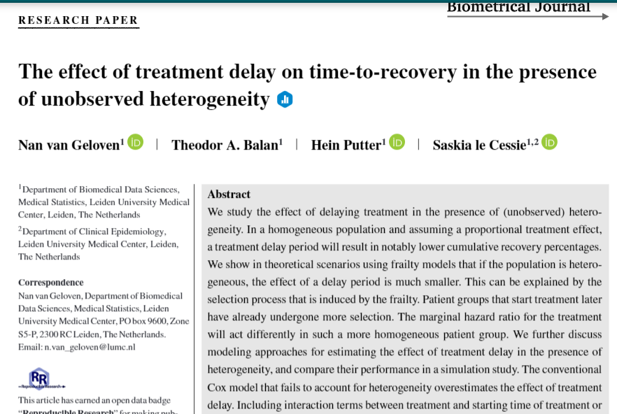 No better way to start my twitter adventure than posting my latest paper (online this week) Q: What is the effect of delaying the start of a treatment? A: depends on the amount of heterogeneity in the patient population. https://onlinelibrary.wiley.com/doi/epdf/10.1002/bimj.201900131 … with