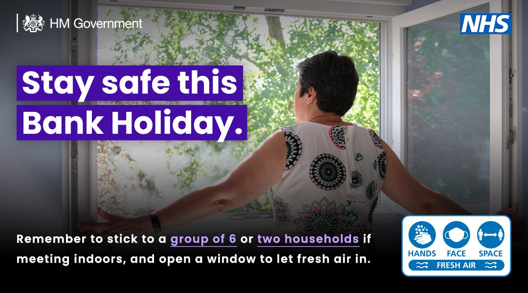 Stay safe this Bank Holiday weekend. Remember to stick to a group of 6 or two households if meeting indoors, and open a window to let fresh air in.pic.twitter.com/N4NgLJn0Bp
