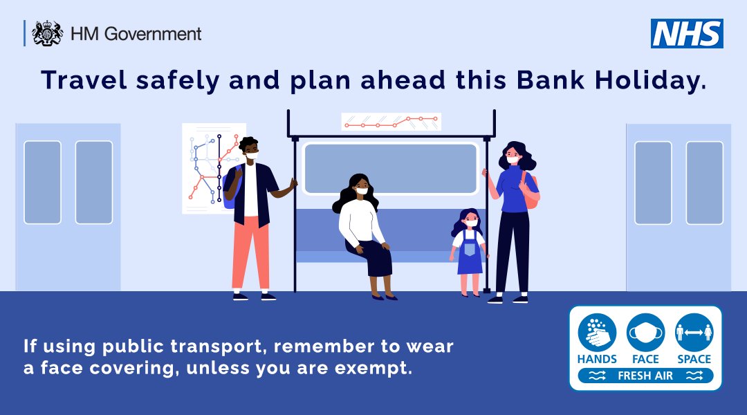 Travel safely and plan ahead this Bank Holiday. If using public transport, remember to wear a face covering, unless you are exempt.pic.twitter.com/mXEz19YSA0