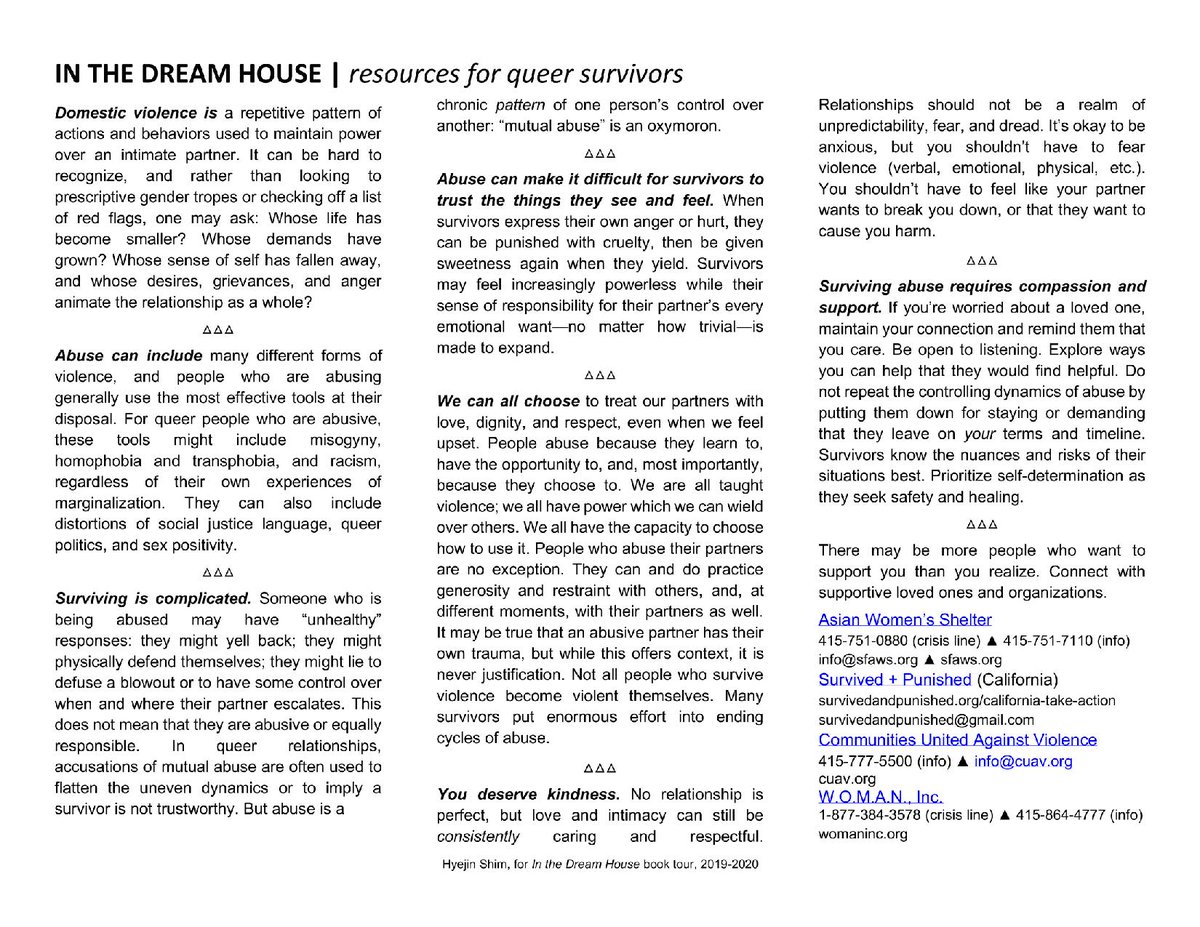 @carmenmmachado calls the “archival silence” surrounding queer domestic abuse. Here are the resources referenced on air, courtesy of@GraywolfPress and developed with Oakland-based organizer Hyejin Shim:pic.twitter.com/fk81rWJfMK