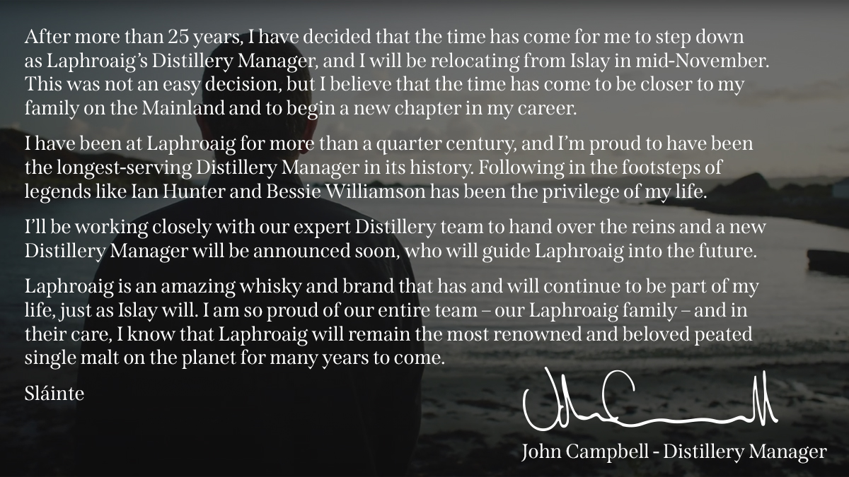 After more than 25 years, I have decided that the time has come for me to step down as Laphroaig’s Distillery Manager, and I will be relocating from Islay in mid-November.
