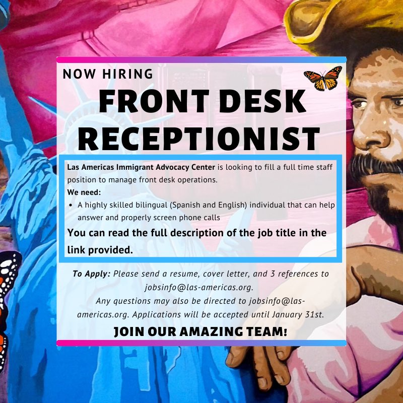 Full description of job position Link: https://las-americas.org/employment With the constant changes in immigration and asylum laws, we are looking for a highly skilled, bilingual individual that can help answer and properly screen phone calls to join our incredible teampic.twitter.com/mvuSa6eHQr
