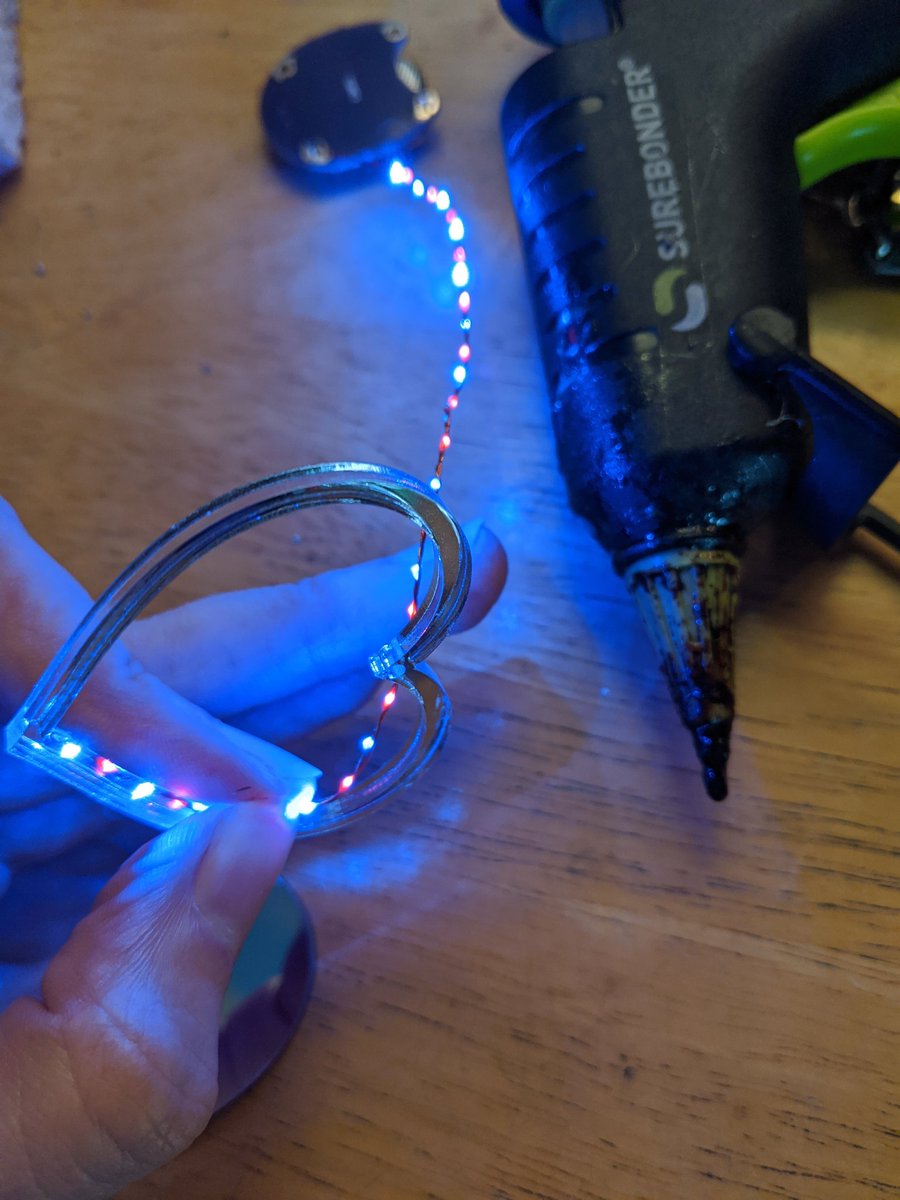 Some deft hot glue maneuvers to place the LEDs inside the hollow heart. Of all the hot glue I had to pull off, this was easiest, and it wasn't very