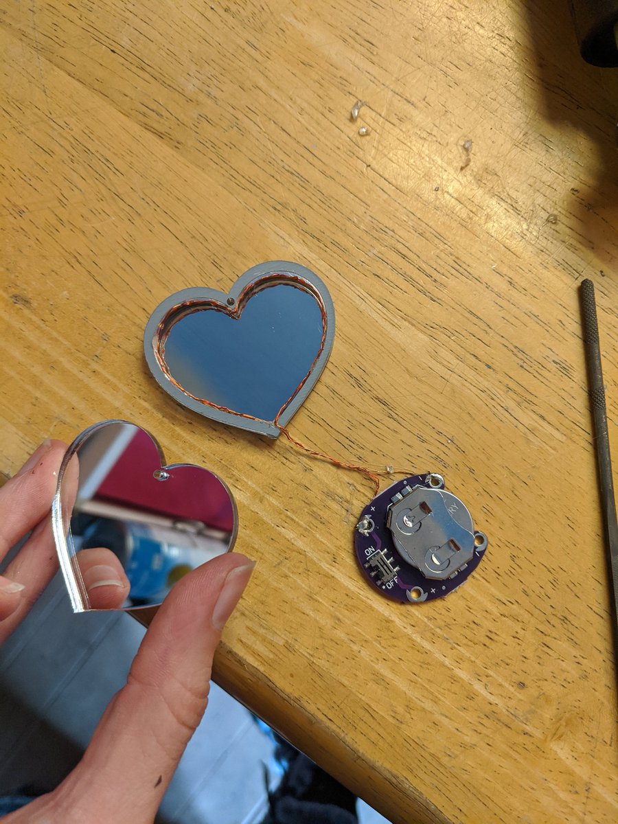 Sandwich the hearts around the hollow hearts, one side a one-way mirror, the other a two-way mirror. This was the hardest hot glue job I've maybe ever done. Worked eventually though.pic.twitter.com/1WJjUxdf3f