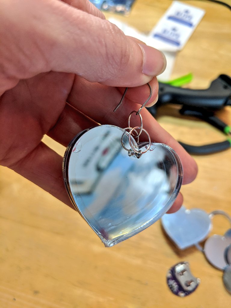 And finally, I had to figure out jewelry findings. I ran a jewelry business for years, so not too hard for me, but complicated. A pin that I put through the thick earring (I had placed holes), looped at both ends, then some jumprings so it faces forward and a titanium fishhook .pic.twitter.com/uQpm1Xx2xP