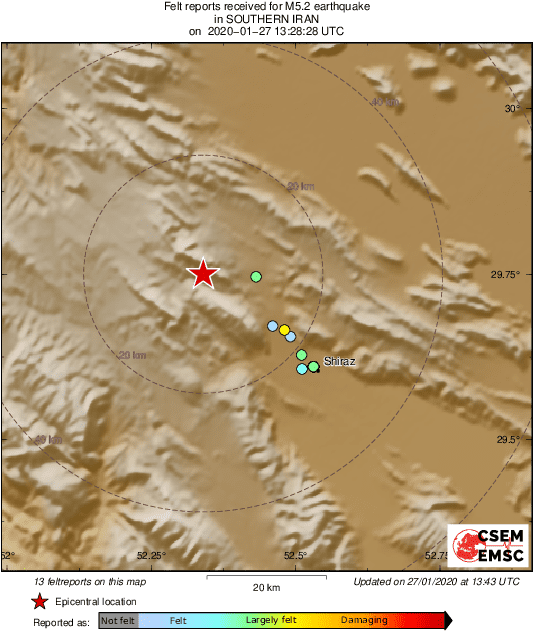 M5.2 #earthquake (#زلزله) strikes 25 km NW of #Shīrāz (#Iran) 17 min ago. Effects reported by eyewitnesses:pic.twitter.com/KSlKtWGOcU