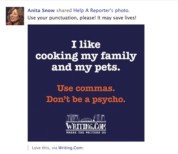 PSA - "Use Commas. Don't be a psycho." Fantastic facebook post from my Tocaya @asnowreportspic.twitter.com/5cp8vT1t4v