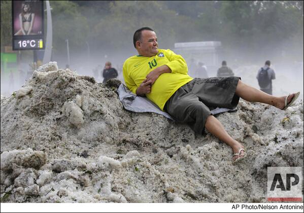 Man spreads out on a hill of hail. Unusual hail storm in Sao Paulo helps to alleviate a dry spell. #crazyweatherpic.twitter.com/fZFZkzhPJq