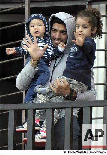 Luis Suarez back in Uruguay. Waves to supporters holding his children Benjamin and Delfina. http://www.theguardian.com/football/2014/jun/27/luis-suarez-treatment-fifa-lawyer-appeal …pic.twitter.com/8DtAfJuvcz