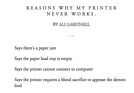 Brilliant! @aligarchy Been thru 3 printers, was on my way to buy a 4th. Think I'll wait. http://www.mcsweeneys.net/articles/reasons-why-my-printer-never-works …pic.twitter.com/xWVpq9VDSX